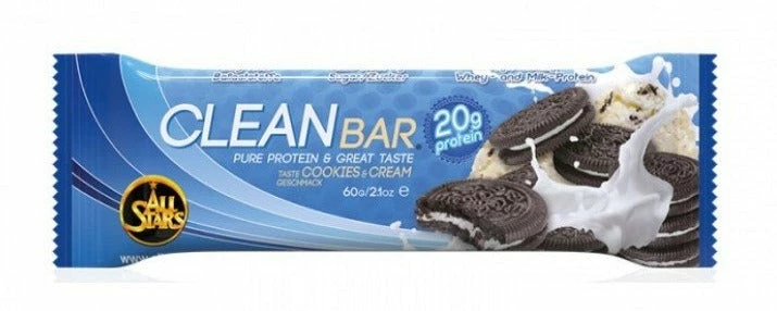 Der Cleanbar ist der neue Proteinriegel von All Stars, ein Low-Carb Riegel mit 20g hochwertigem Protein und weniger als 3g Kohlenhydrate und Zucker! All Stars Cleanbar liefert eine hochwertige Eiweissquelle. Der Riegel ist ideal für Fitness, Bodybuilding oder die Low-Carb Ernährung. Der Proteinanteil von 20g pro Riegel sorgt für Muskelaufbau und Muskelschutz. Daher eignet sich der All Stars Clean Bar ideal für den Muskelaufbau-, aber auch für Diät- und Definitionsphasen. Dank des niedrigen Zuckeranteils und geringer Menge an Kohlenhydraten ist der schmackhafte Low-Carb Riegel der ideale Proteinlieferant im Alltag.