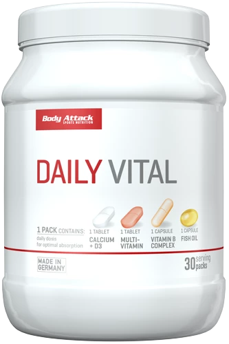 Daily Vital von Body Attack ist ein Multi-Vitamin-Präparat, das sich aus 30 abgepackten Tagesportionen zusammensetzt. In einer Tagesportion sind besonders wichtige Nährstoffe mit denen der Körper versorgt sein sollte. Dazu gehören: