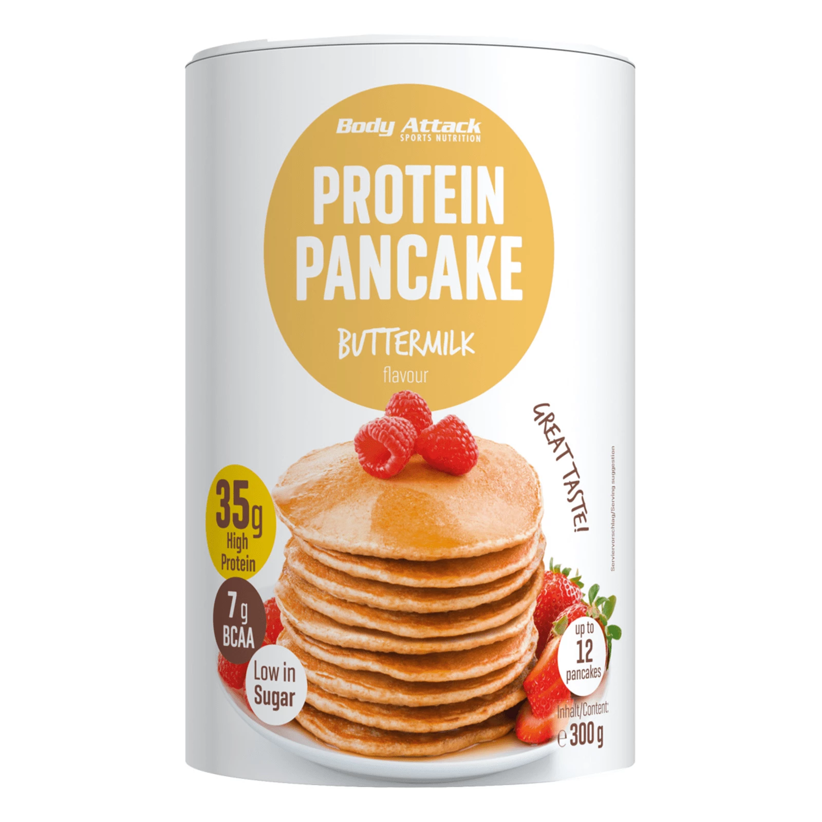 Der Body Attack Pancake ist eine Fertigmischung für eine schnelle, einfache Zubereitung eines zuckerarmen Pfannkuchens. Ideal geeignet für Genießer, die auf eine figurbetonte und proteinreiche Ernährung achten und keine Lust und Zeit haben, lange in der Küche zu stehen. Die Mischung des Pancakes besteht aus Weizenmehl kombiniert mit Molken-, Milchproteinen und Hühnereiweiß, wodurch optimale Nährwerte erreicht werden. Das heißt, die Pancake-Mischung liefert einen Proteingehalt von bis zu 36g auf 100g. Die Nahrungsproteine, die im Pancake enthalten sind, können zum Aufbau und Erhalt von Muskelmasse dienen. Durch die zugesetzten Süßungsmittel ist der Zuckergehalt deutlich reduziert (3-5 g/100 g Pfannkuchen-Fertigmischung). Die zuckerarme Rezeptur unterstützt somit eine kohlenhydratarme Ernährung und ist besonders zu Beginn oder während einer Diätphase geeignet, wo Süßspeisen eigentlich vom Speiseplan gestrichen werden. Da der Heißhunger darauf aber trotzdem bleibt und um dem JO-JO-Effekt entgegen zu wirken, empfiehlt sich der Pancake als süße, zuckerarme Alternative.