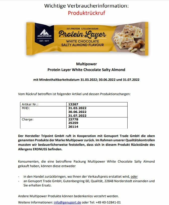 Der Hersteller Tripoint GmbH ruft in Kooperation mit Genuport Trade GmbH die oben genannten Produkte der Marke Multipowerzurück. Im Rahmen unserer Qualitätskontrollen mussten wir bedauerlicherweise feststellen, dass sich in diesem Produkt Rückstände des Allergens ERDNUSS befinden.