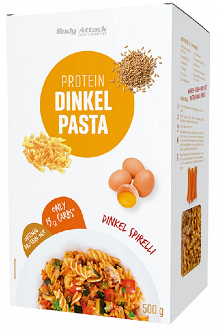 Die Protein Nudeln von Body Attack bestehend aus Dinkelgrieß und frischem Hühnerei sind eine qualitativ hochwertige und leckere Alternative für eine eiweißreiche Ernährung. Durch die Kombination der pflanzlichen und der tierischen Proteinquelle erreichen die Nudeln eine sehr hohe biologische Wertigkeit von über 100. Dazu sind die Bandnudeln von Body Attack sehr bekömmlich, im Handumdrehen zubereitet und lecker im Geschmack.