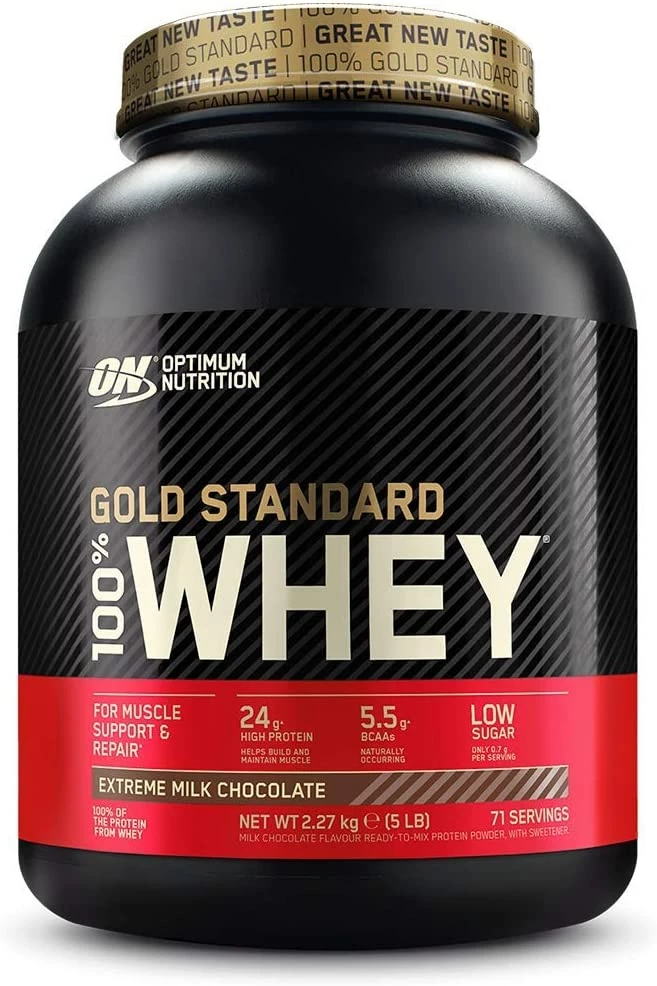 100% Whey Gold Standard von Optimum Nutrition setzt sich aus Whey Protein Isolat, Wheyprotein Konzentrat und Wheyprotein-Peptiden zusammen. Die enthaltenen hochqualitativen Proteine des Eiweißpulvers wurden in der Herstellung ultra- bzw. mikrofiltriert, und dadurch nicht denaturiert. ON Gold Standard ist reich an BCAAS (Branched Chain Amino Acids) und L-Glutamin, und zeichnet sich durch hervorragenden Geschmack, ob nun in Wasser oder Milch, aus. Das Pulver löst sich rasch und einfach auf, und ist leicht verdaulich. Durch die Zugabe der beiden verdauungsfördernden Enzyme Lactase und Aminogen wird außerdem die Verdauung des Eiweißes vereinfacht bzw. gefördert. 100% Whey Gold Standard ist in zahlreichen leckeren Geschmacksrichtungen erhältlich: Rocky Road, Chocolate Mint, Peanut Butter, Vanille-Eis und viele mehr.