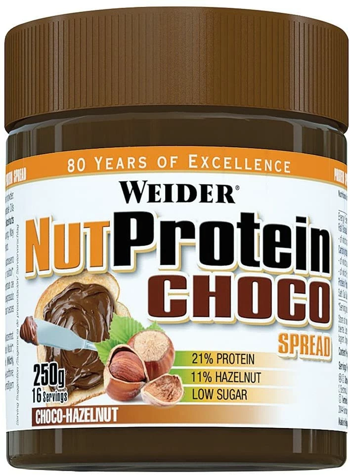 Nut Protein Choco Spread: Eiweiß-Haselnuss-Aufstrich mit Molkeneiweißkonzentrat. Mit Süßungsmittel. Weider Nut Protein Choco Spread ist ein köstlicher Eiweiß-Haselnuss Aufstrich mit 21% Protein und 11% Haselnüssen, hochwertigem Molkenprotein, welches reich an essentiellen Aminosäuren und BCAAs ist, sowie 2,1g Zucker pro Portion (15g).